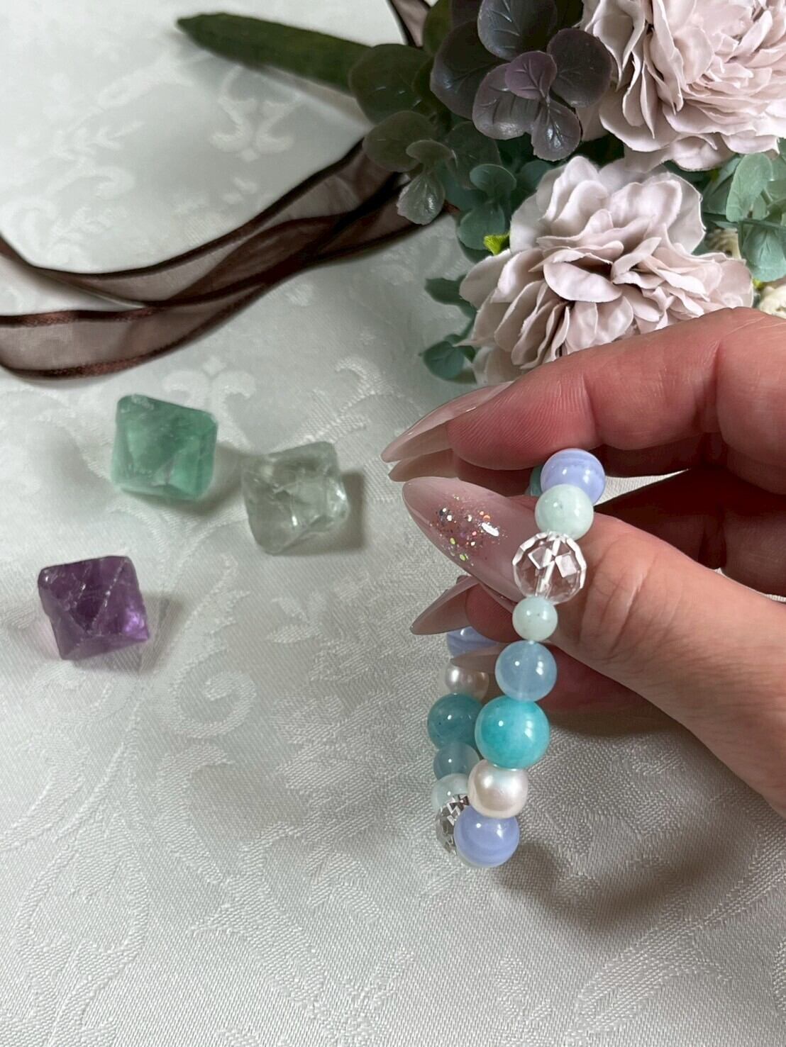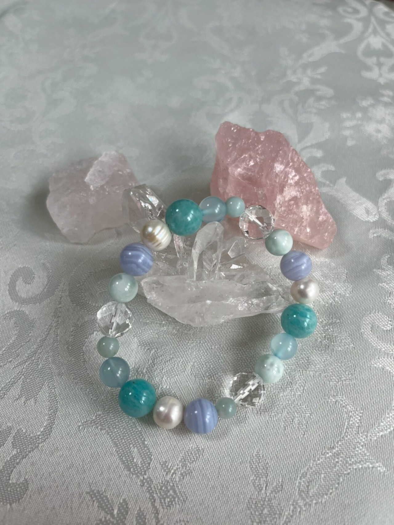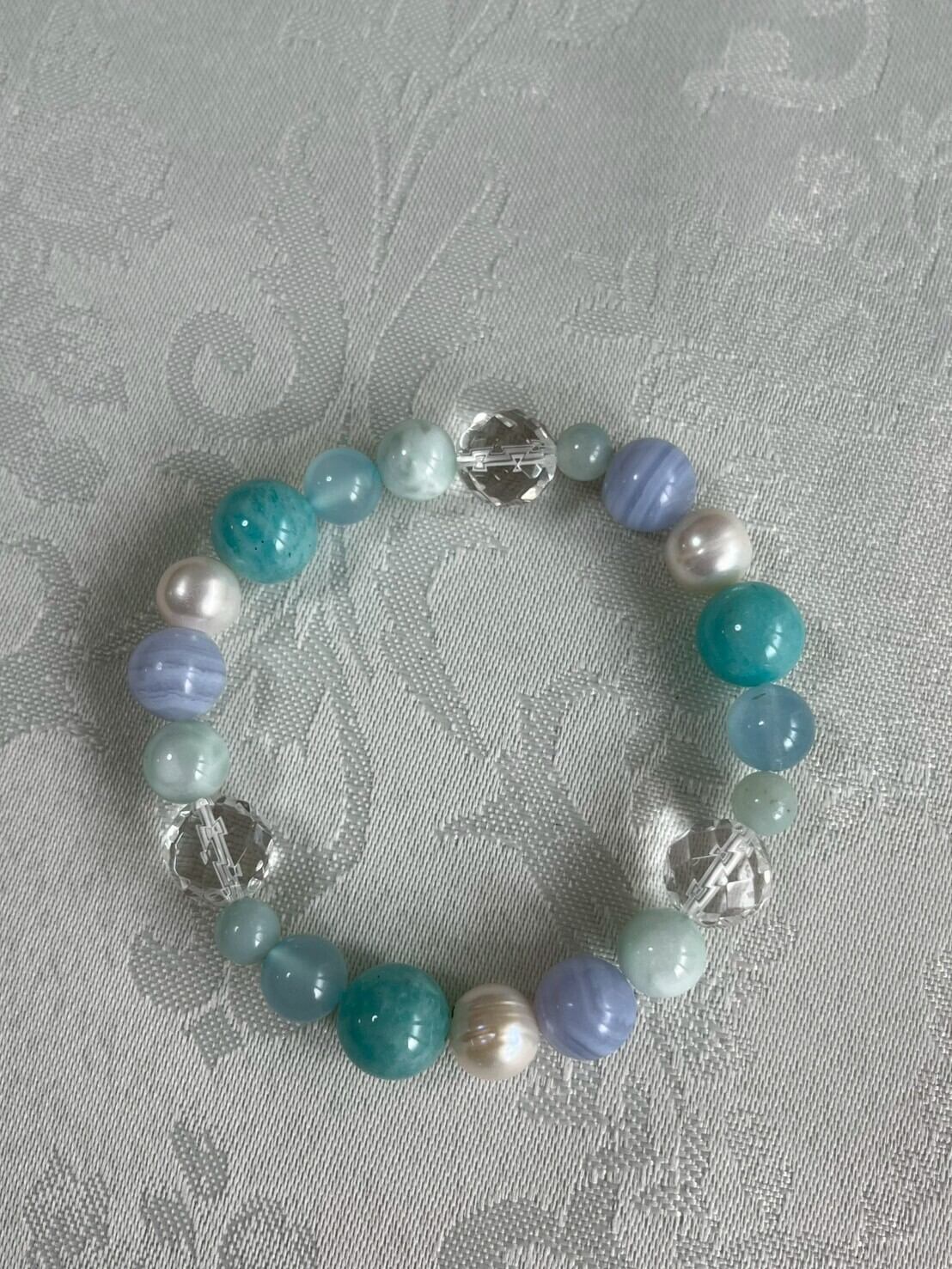こちらはのブレスレットは、愛の花アガパンサスをイメージして作りました。恋愛はもちろん、近所関係、仕事関係、家族関係などの人間関係に悩んでいる方におすすめのブレスレットです。良好な人間関係を築けるよう、コミュニケーションに良い石を集めました。良好な人間関係を築くには、自分自身の気持ちも平安で穏やかでなければなりません。水晶は心のもやもや、悩み、不安、ギスギスした気持ちを取り払ってくれます。パールや天使の石、セラフィナイトは高いヒーリング効果を発揮します。アマゾナイト、ブルーレースアゲート、シーブルーカルセドニーは、心を癒し優しい気持ちにさせてくれます。メンタルバランスが整う事で、良好な人間関係を築く後押しになる事でしょう。ブルーレースアゲートや、シーブルーカルセドニーは、他者と調和、共感する力をもたらします。パールは厄除け効果があり、災いを跳ね除けてくれます。また良縁を引き寄せる効果もありますから、人間関係のゴタゴタやトラブルが多い、気がつけば他者のトラブルに巻き込まれている事が多い方におすすめです。ご自身にマイナスとなる人間関係を取払い、ご自身のプラスになる縁を呼び寄せる事で、仕事力、日々の生活における生産性の向上が期待出来ます。人間関係が豊かさになれば、物質的な豊かさをももたらしてくれる事でしょう。