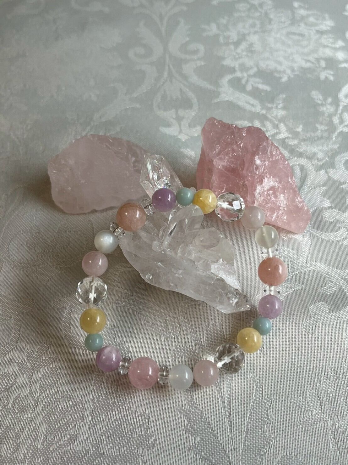 モルガナイト・クンツァイト・ローズクォーツ・ムーンストーン・アラゴナイト・水晶・アマゾナイト